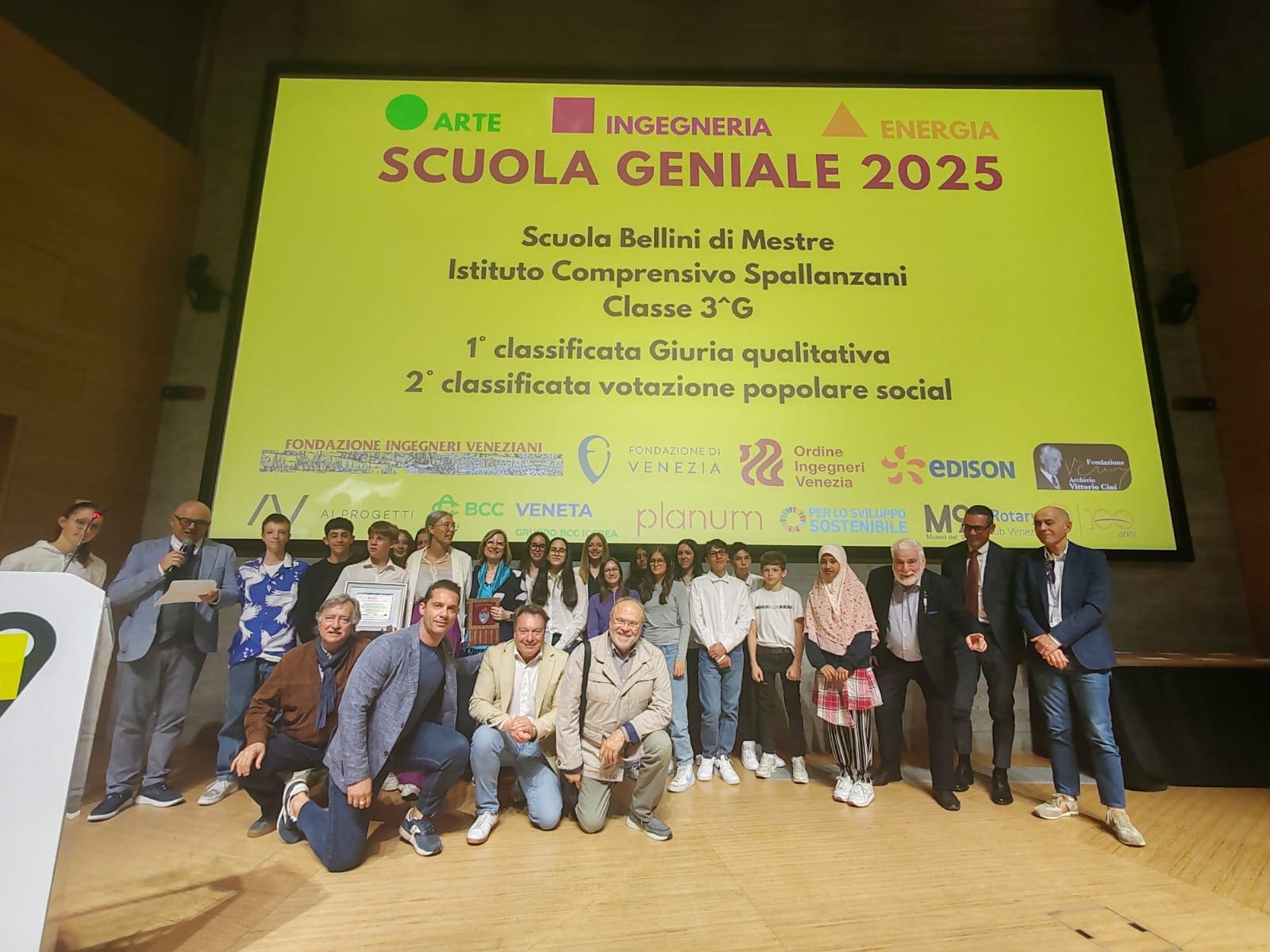 L’edizione 2025 di Scuole Geniali è stata vinta dalla Scuola Bellini di Mestre. Sul podio, a seguito delle valutazioni della Giuria qualitativa, sono salite le scuole Paolo VI di Chioggia e Goldoni di Martellago. Buoni risultati hanno ottenuto le scuole Dante Alighieri di Venezia, Giuseppe Olivi di Chioggia Borgo, Ugo Foscolo di Marghera e Gino Strada di Malcontenta di Mira. Le votazioni popolari delle opere hanno registrato 1.604 voti.