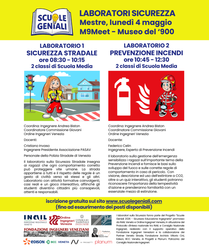 I laboratori sulla Sicurezza sono un’iniziativa del Progetto “Scuole Geniali 2026 – Sicurezza Educazione Ingegneria” promosso da INAIL Veneto e Ordine Ingegneri Venezia, in attuazione del Protocollo d’Intesa nazionale tra INAIL e Consiglio Nazionale Ingegneri, realizzato con il supporto operativo della Fondazione Ingegneri Veneziani e la collaborazione dei Partner Veneto Strade, Fondazione Archivio Vittorio Cini, Edison, BCC Veneta, AI Progetti e Planum. Patrocinio del Consiglio Nazionale Ingegneri.