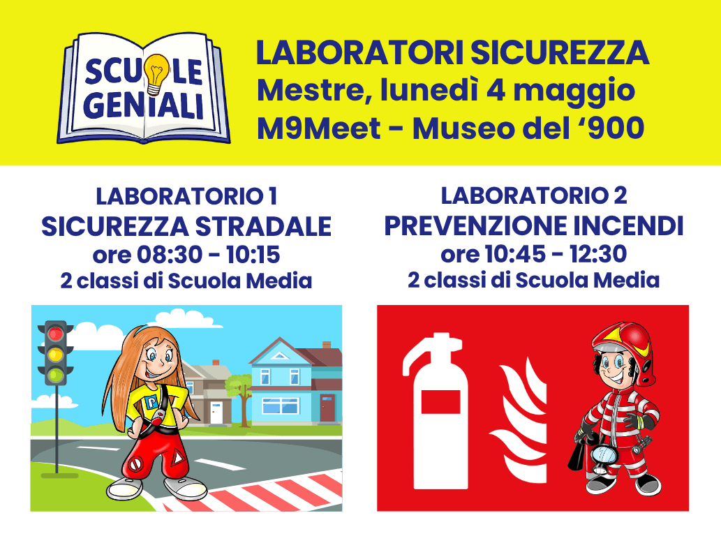 Sono aperte le iscrizioni gratuite ai Laboratori Sicurezza rivolti agli studenti delle scuole medie, in programma lunedì 4 maggio a Mestre, presso M9Meet – Museo del ’900. Due appuntamenti formativi e interattivi pensati per coinvolgere i ragazzi sui temi della prevenzione e della responsabilità civica.